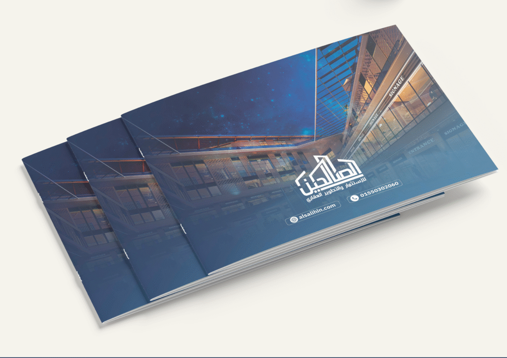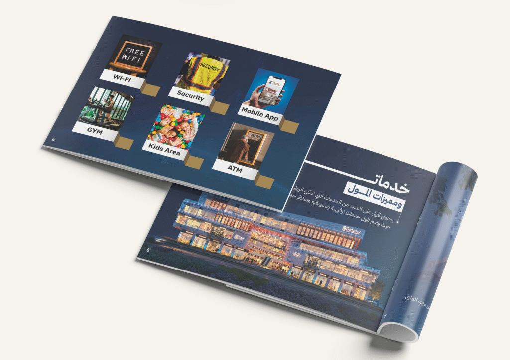 Structured around the mall’s vision, market positioning, and visitor experience, the profile combines full-page visuals with concise text for clarity and impact. A refined navy-and-copper color palette and minimal iconography highlight elegance and functionality.